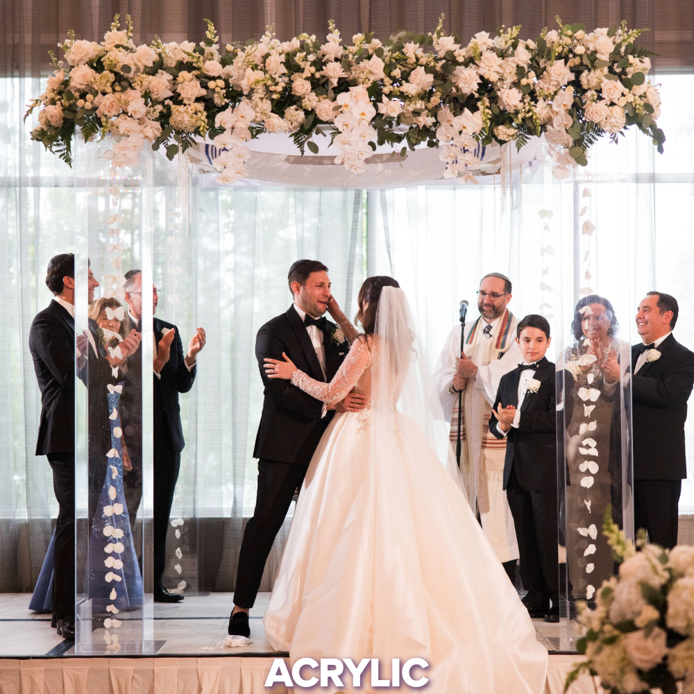 Modern chuppah designs maintain the sacred tradition but embrace a more contemporary, design-forward aesthetic. Our acrylic chuppah is a stunning example! Made from clear, transparent material, this chuppah style allows light to pass through naturally. This modern chuppah looks incredible both indoors and outdoors, as its transparency lets your florals and surroundings take center stage.