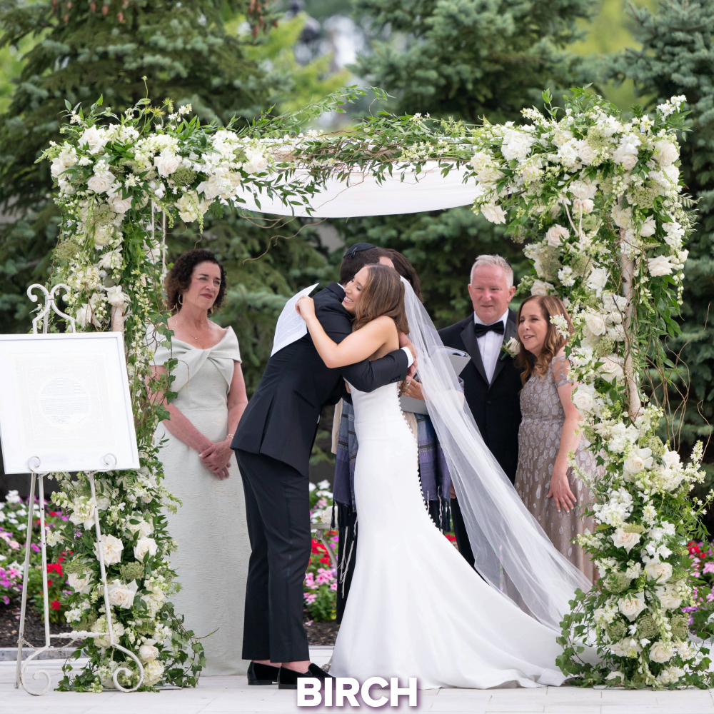 Our birch tree chuppah is also our most customizable option! Couples can choose a single floral arrangement across the top, cascading flowers down each side, or full floral coverage for a lush, stunning design. A birch chuppah brings a sense of grounded beauty to your ceremony, blending seamlessly into outdoor settings and creating a truly unforgettable atmosphere.