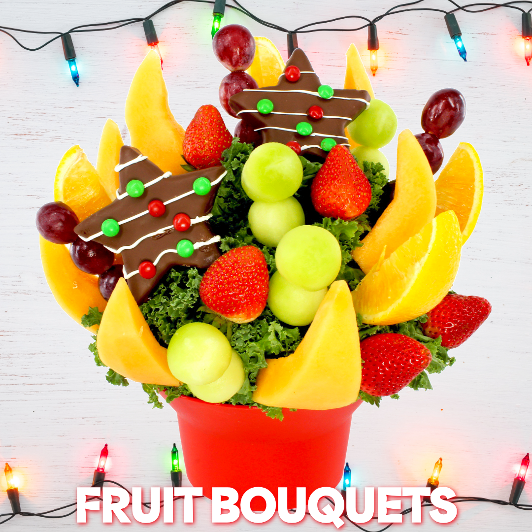 Send something sweet this year! Our Christmas fruit bouquets — including our favorite Starry Chocolate Nights — feature chocolate-covered pineapple cut into star shapes, finished with red and green chocolate “ornaments.” These cheerful Christmas arrangements add a tasty twist to holiday gifting.