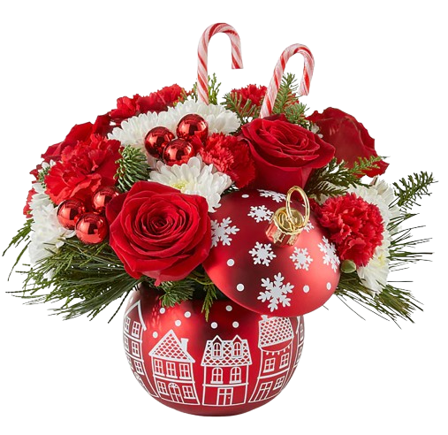 Hand-crafted with fresh flowers, this beautiful flower arrangement includes red roses, red carnations, white mums, assorted greens, and christmas ornaments.