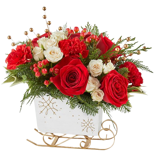 Designed with fresh flowers, this beautiful flower arrangement includes red roses, red carnations, white spray roses, red hypericum berries, and assorted Christmas greeneries.