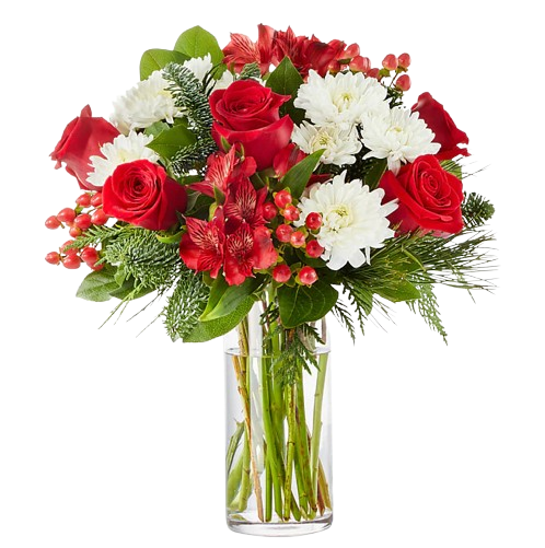 Designed with fresh flowers, this beautiful holiday floral arrangement includes red roses, white cushion poms, red alstromeria, red hypericum berries, and assorted christmas greens.