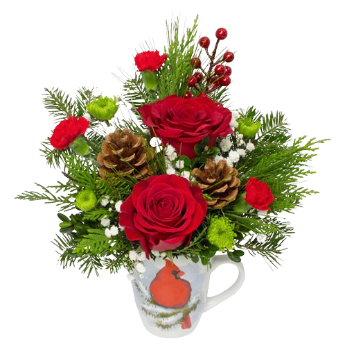 Designed with fresh flowers, this beautiful flower arrangement includes red roses, red mini carnations, baby's breathe, berries, pinecones and assorted greens.