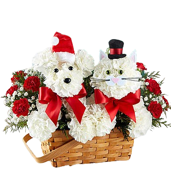 Hand-crafted with fresh flowers, this beautiful flower arrangement includes red carnations, a dog dressed up like santa, and a cat in a black top hat with assorted greens.