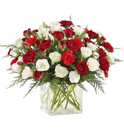 Designed with our highest quality flowers, this beautiful flower arrangement includes red roses, white roses, red spray roses, red mini carnations, white carnations, red carnations and assorted greens.
