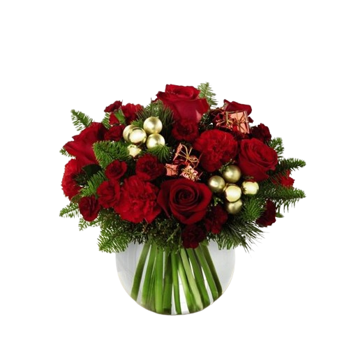 Designed with fresh flowers, this beautiful flower arrangement includes red roses, red spray roses and red carnations accented with gold and red ornaments with Christmas greens.