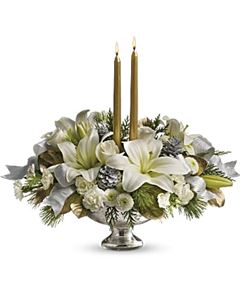 Designed with our highest quality flowers, this beautiful flower arrangement includes bright white lilies, white carnations, white button poms, pinecones, festive ribbons, winter greeneries, and candles.