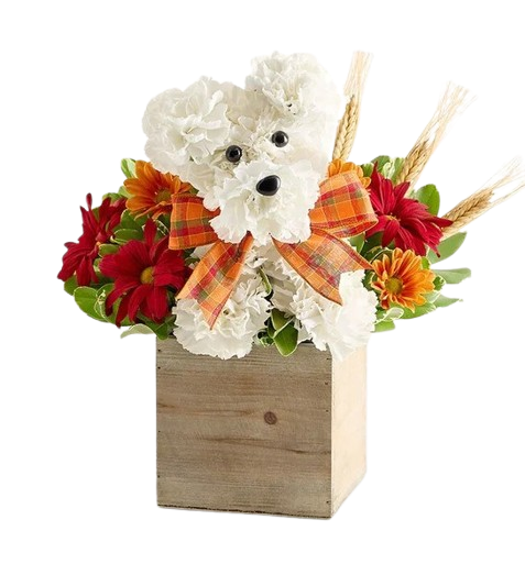 Our whimsical autumn arrangement is doggone adorable! Popping out of a wooden cube, this playful pooch is hand-designed from fresh white carnations, with colorful daisy poms all around. It’s a charming and original gift to share for a season full of celebrations.