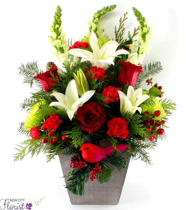 Designed with fresh flowers, this beautiful flower arrangement includes white lilies, red roses, green spidermums, red mini carnations, white snapdragons, berries, pinecones, fresh pine, and assorted greens.