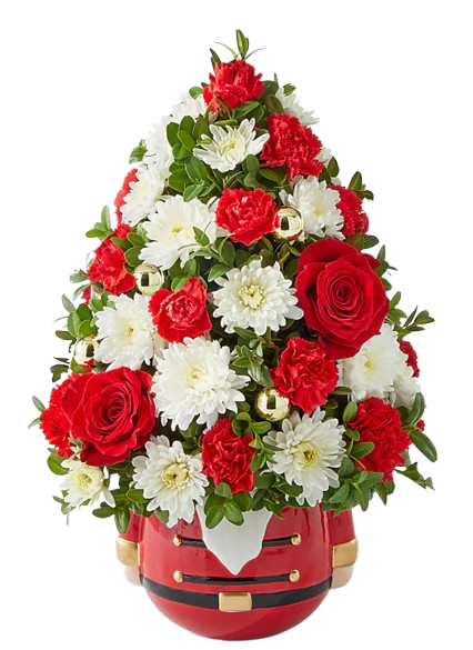 A headturning mini tree fit for a king or queen, this arrangement includes, roses, carnations, and mums, perfect to adorn a holiday table.