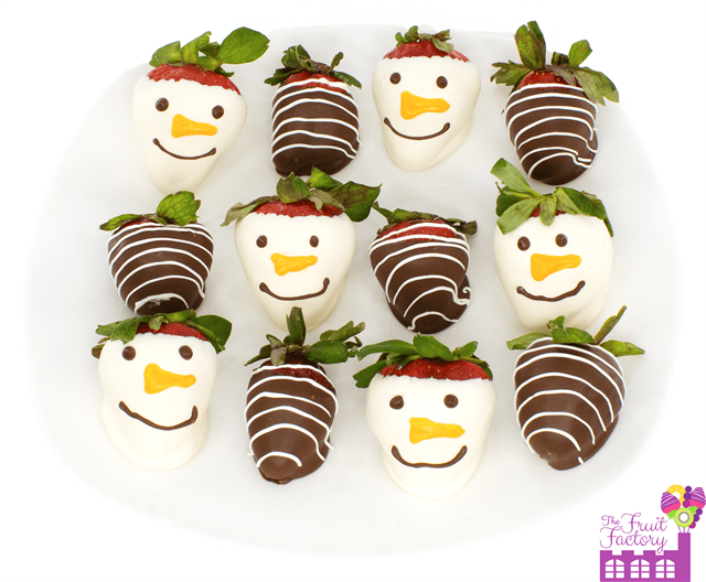 Enjoy a festive Dozen Chocolate Covered Strawberries with white-chocolate Snowman designs!