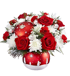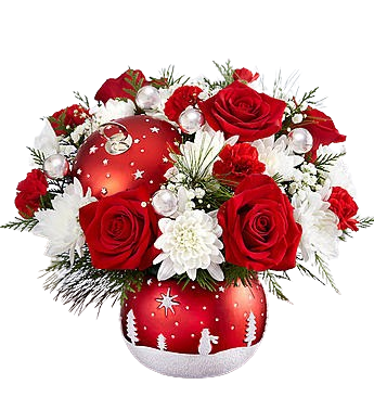 Designed with fresh flowers, this beautiful flower arrangement includes white cushions, red roses, red mini carnations and greenery accented with decorative ornaments.