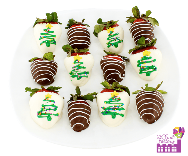 Enjoy a festive Dozen Chocolate Covered Strawberries with white-chocolate Christmas Tree designs!